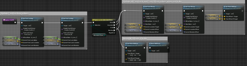 - FootLock_L从1过渡到0.0:左脚从alpha小于等于0.99开始逐渐变为动画完全控制。【因为modify bone节点的alpha逐渐变为0.0,也就是完全和动画的骨骼同步。】