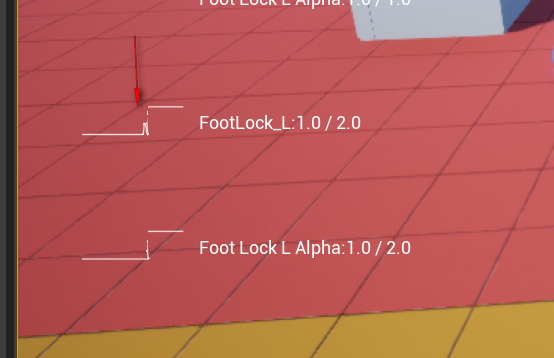 箭头处是松开方向键的瞬间,FootLock_L由0.0上升到了大概0.3,这是由于Not Moving的修改曲线引起的,之后曲线值又开始下降,这个应该是播放踏步动画引起的。