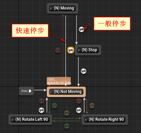 - 离开【(N) Not Moving】节点时增加事件“StopTransition”